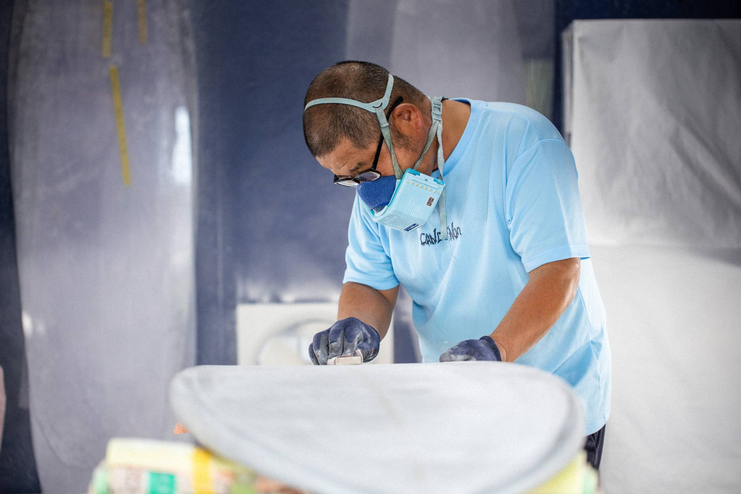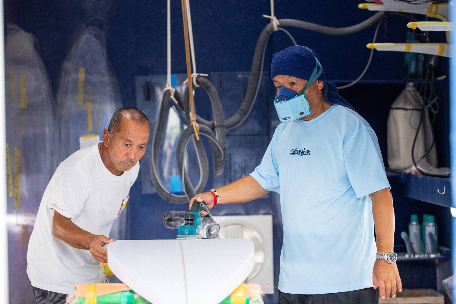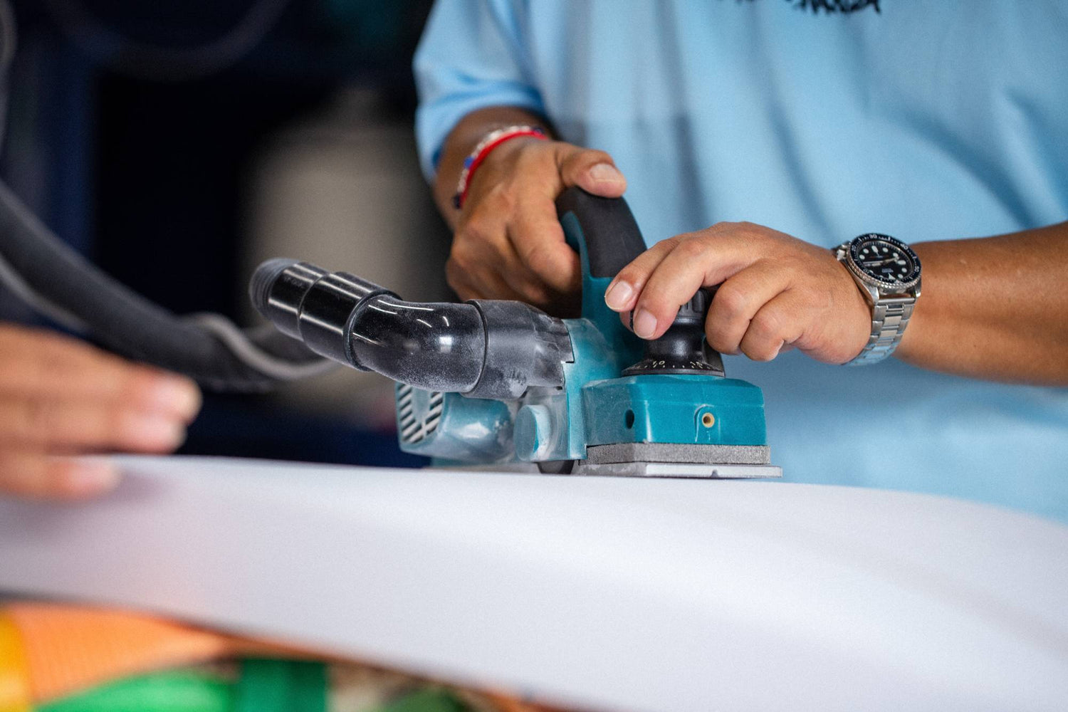 サーフボードの表面を滑らかに磨き上げ、最終的なラインを整えます。